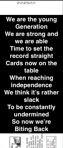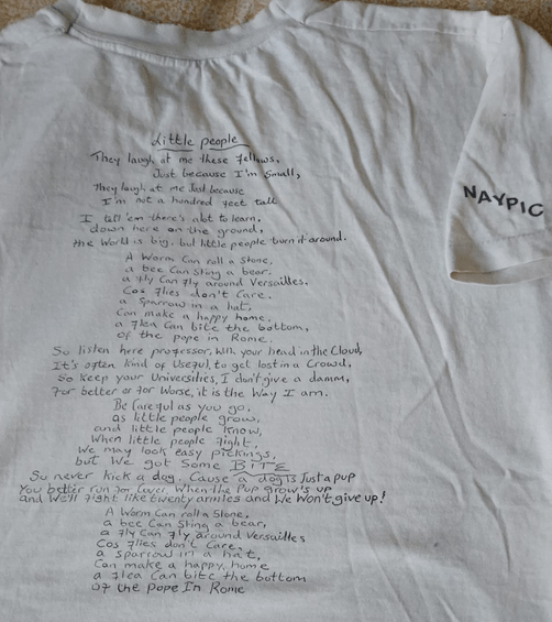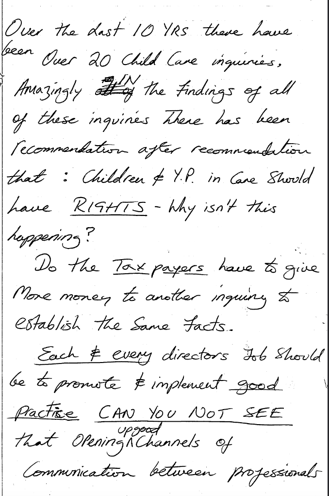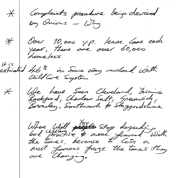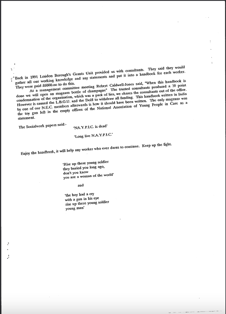 This is the song.. but the words are faded out.. “They said that you were trouble, and you didn’t care, you were just an orphan child, that was getting nowhere, Mama was leaving, Papa was too, who was there to care about, ohhhwhat happened to you. Many broken hearts, led you to cry, the tears fell from your eyes as you said your goodbyes. Now that we’re all older, we’ve grown so strong, we can tell the world about our song, a song for the children.. (Then 350 of us sang, 25 on stage and the rest in our audience).. We all need, we all needheeeeed.. We all nee…eed, a song for the children. They said that you were trouble, and it wasn’t fair, why am I classed as a number, just because I’m in “CARE”. No one to trust, though they may seem kind, what they don’t realise, is we’ve still have a mind. Now your on your own with your messed up feelings, we will make them aware, when they hear us singing, we’re singing now baby..(Chorus 350 young people in ‘care’ NAYPIC 1991).. We all need, we all need, we all need, a song for the children… And now your minds not your own, but you had to carry on, and what they took from me, I can’t let them take my dignity, your face was so surprised, when you fell with tears in your eyes but now I’m back on feet and I can the world now, singing in every town, (guitar rift…) Everybody.. we all need, we all need, we all need, yeahhh a song for the children.. we all need, come on and sing it, we all need, come on and sing it now babe, we all need, a song for the children… We all need, sing, we all need, we all need, yeahhh, A SONG FOR THE CHILDREN, We all need, we all need, yea we all need, A SOOOOOONNNNNGGGG for the childrennnnn, (fade) we all need.. (re-entrance) a song for the, a song for the.. (children sing ”CHILDREN”) we all need, we all need, we all need, A SONG FOR THE CHILDREN (Abrupt End)