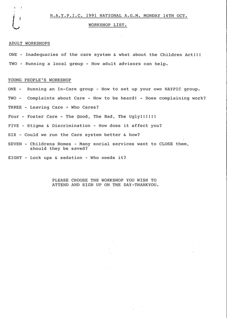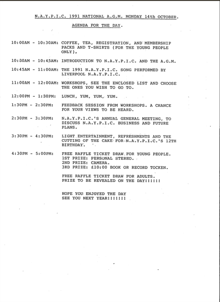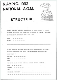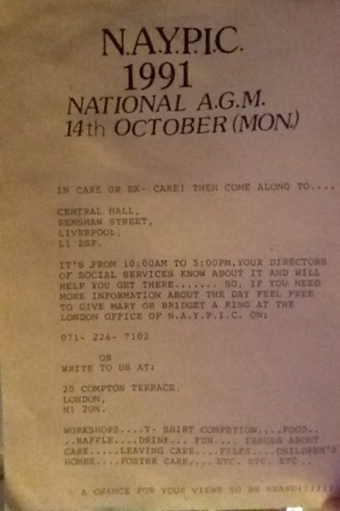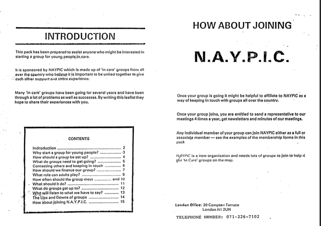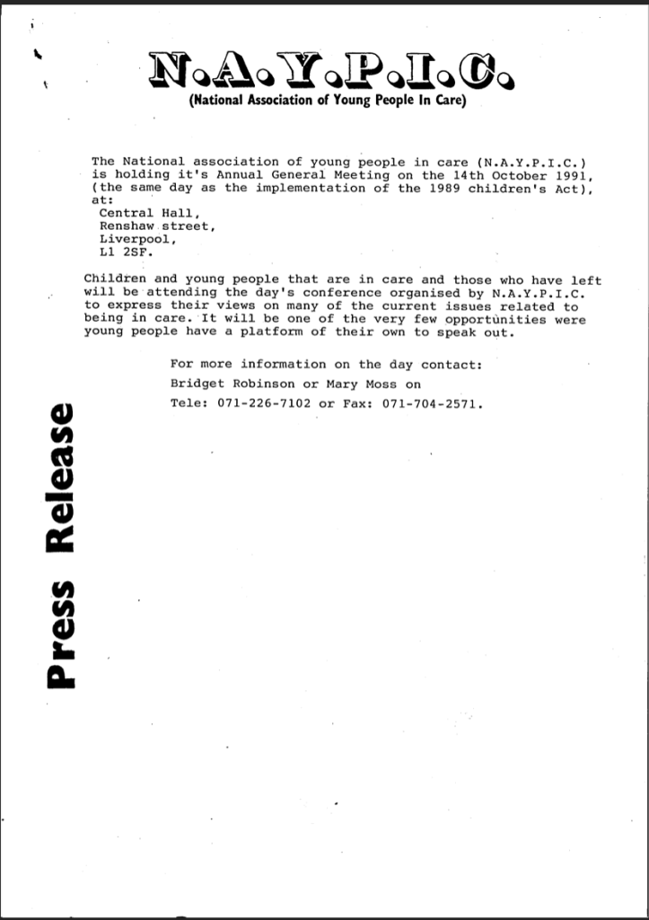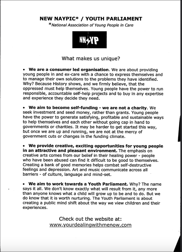 1993 Implementation of New NAYPIC / Youth Parliament. Expansion from young people in care to all children in the UK 12 million children, hence a Youth Parliament, led by victims and survivors in care. The day had 1100 young people in care attend at Stucley Street, Camden Town
