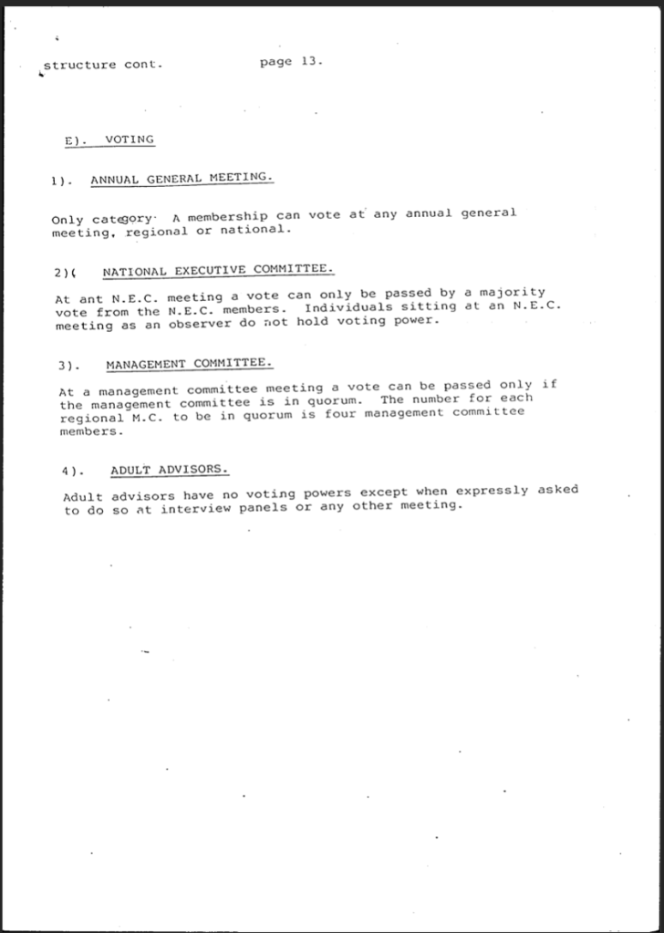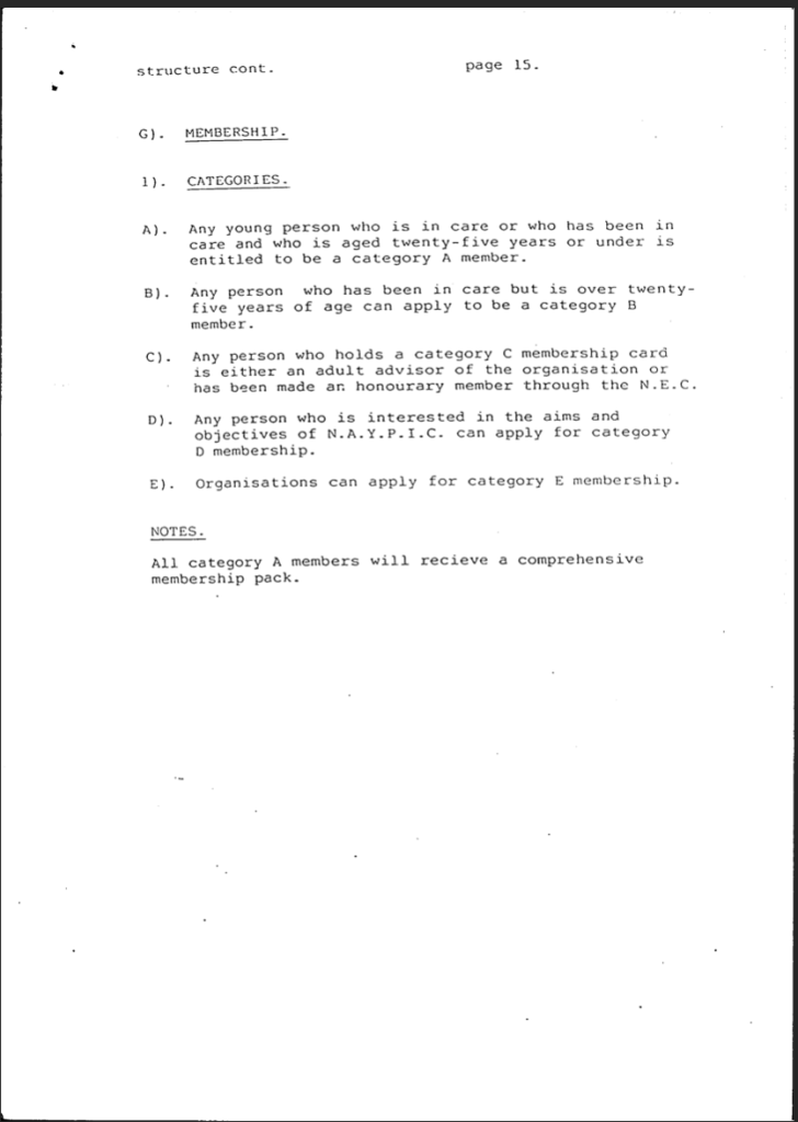National Association of Young People In Care ‘Structure’ voted in at conference 1991 at the ‘Biting Back’ conference by 350 UK children in care.